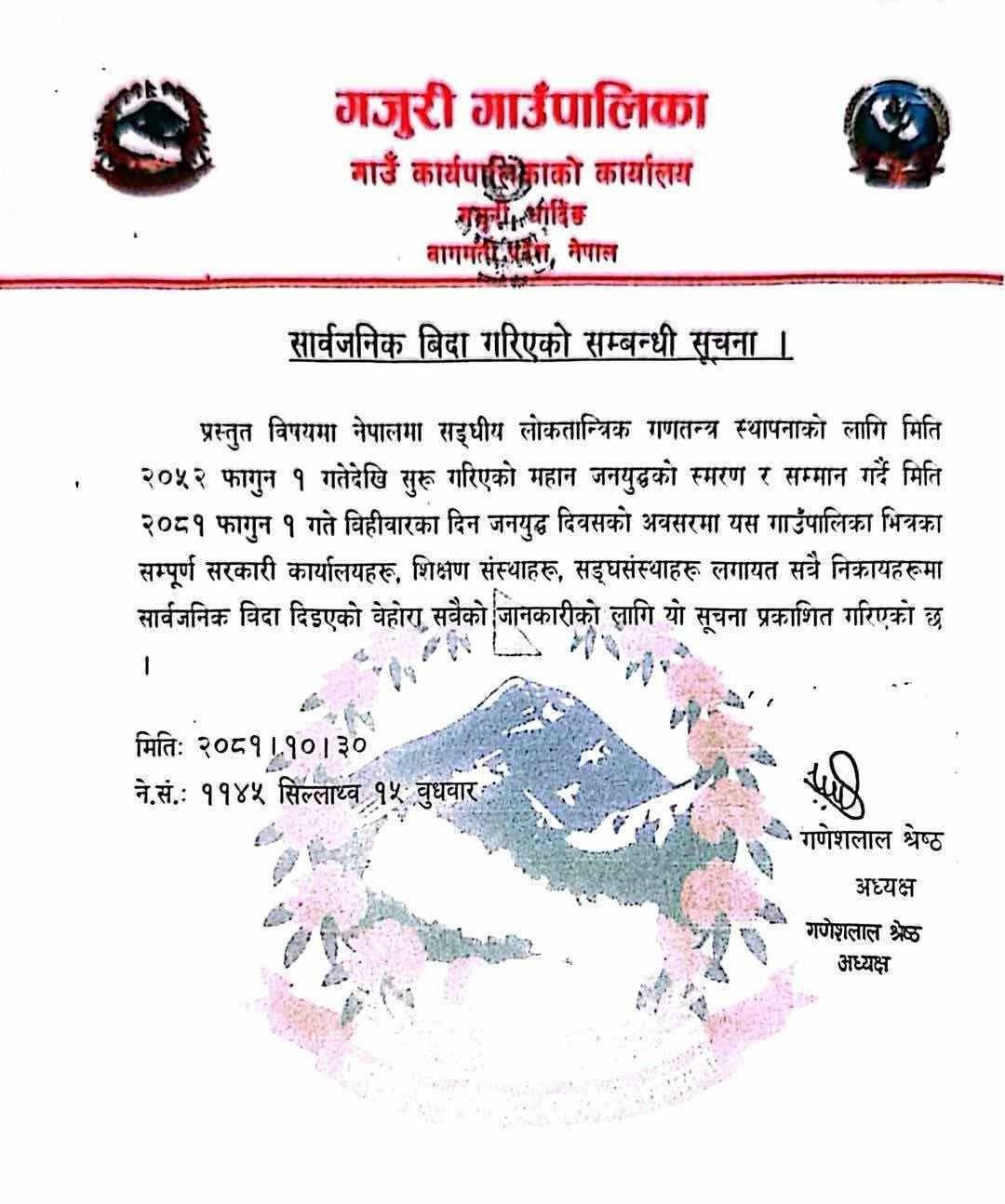 धादिङ । धादिङको गजुरी गाउँपालिकामा जनयुद्ध दिवसका अवसरमा सार्वजनिक बिदा दिने कि नदिने भन्ने विषयमा अध्यक्ष र उपाध्यक्षबिच विवाद देखिएको छ । बुधवार गाउँपालिका अध्यक्ष गणेशलाल श्रेष्ठले जनयुद्ध दिवसका अवसरमा सार्वजनिक बिदा दिने सूचना जारी गरेका थिए ।