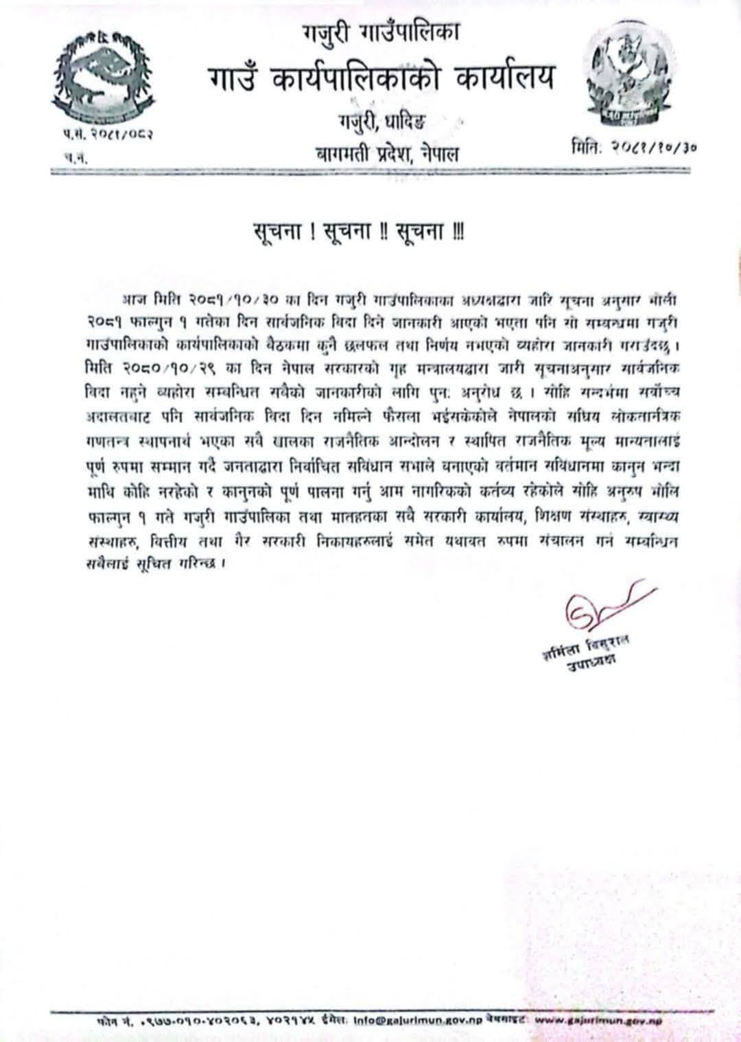 अध्यक्ष श्रेष्ठले बिदाको सूचना सार्वजनिक गरे लगत्तै उपाध्यक्ष शर्मिला बिसुरालले गाउँ कार्यपालिकाको बैठकले सोसम्बन्धी कुनै निर्णय नगरेको भन्दै फागुन १ गते सार्वजनिक बिदा नभएको सूचना प्रकाशित गरेकी छन् ।