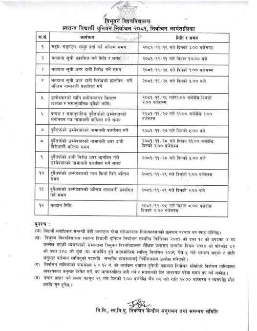काठमाडौँ — त्रिभुवन विश्वविद्यालयले आगामी चैत ५ गते हुने स्वतन्त्र विद्यार्थी युनियन निर्वाचनको कार्यतालिका सार्वजनिक गरेको छ ।
